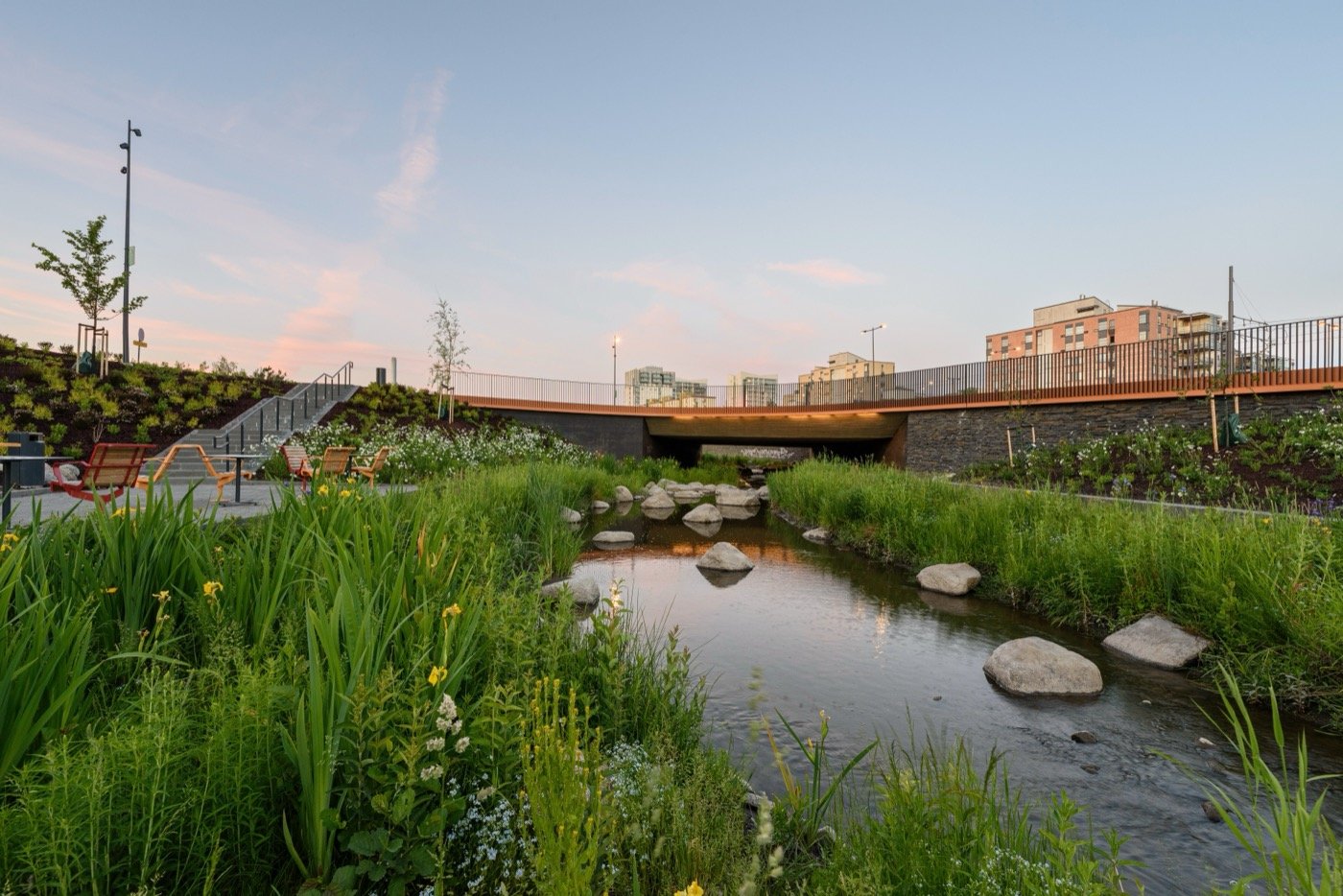 - Khai thác công viên linh hoạt ngay cả khi lũ lớn: các bức tường chắn cao bao quanh các lô đất giúp bảo vệ và ngăn lũ, đồng thời tích hợp các bục ghế ngồi tạo không gian giao lưu và thư giãn bên bờ suối.