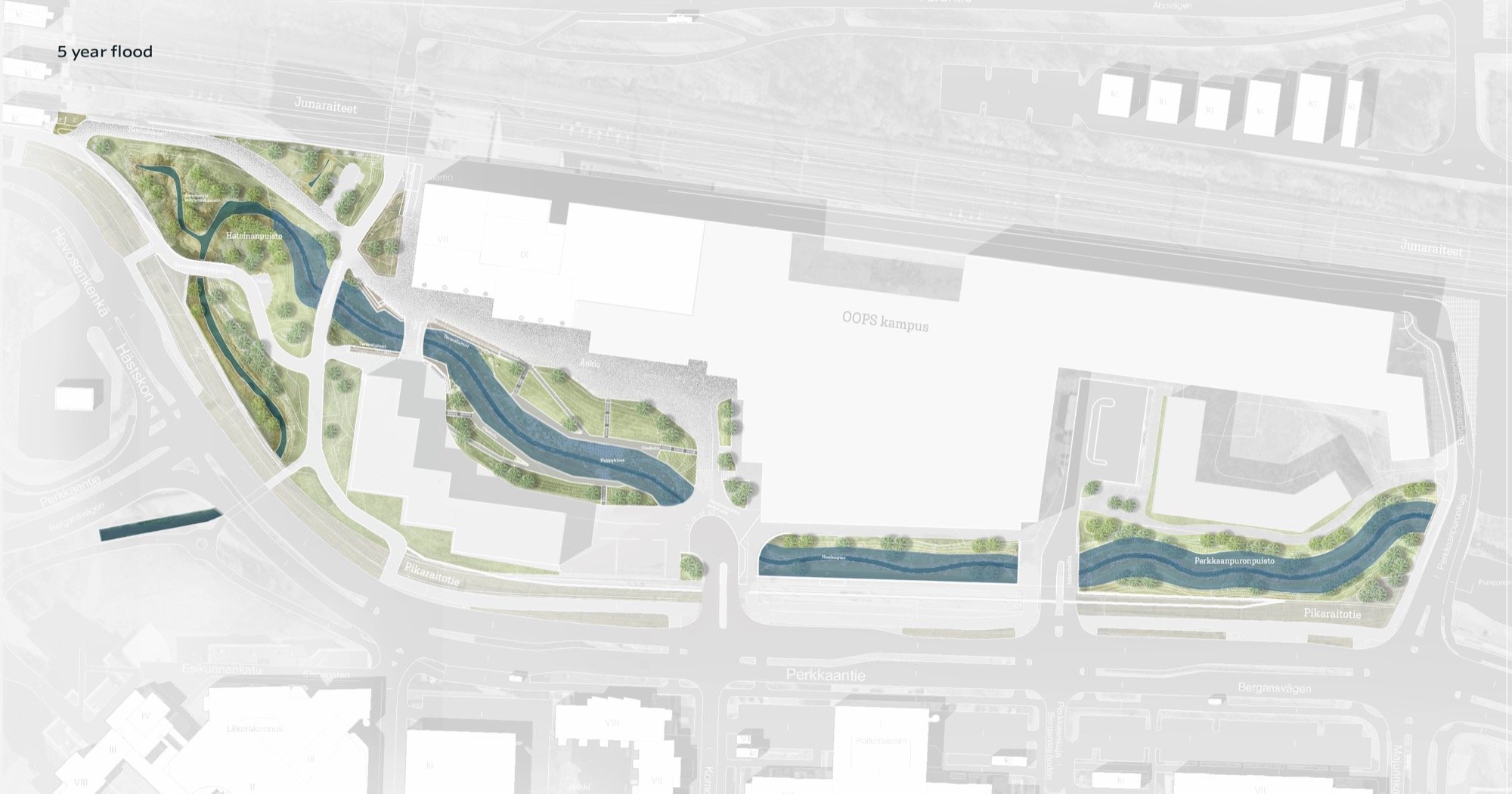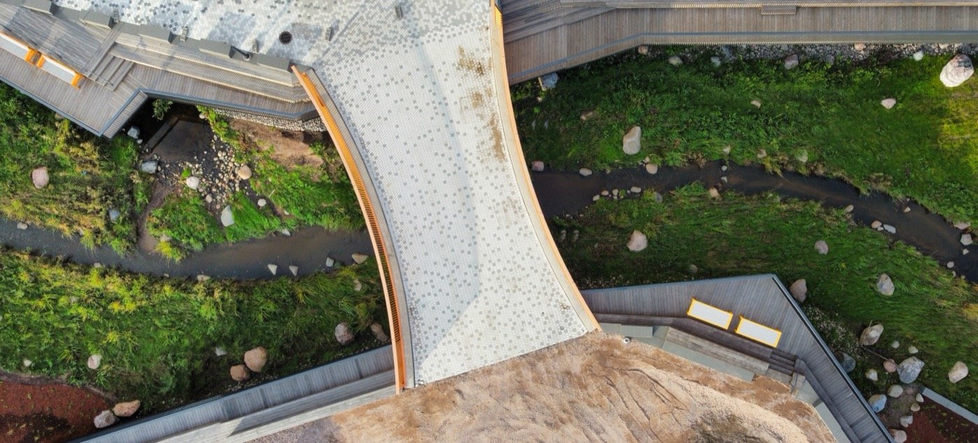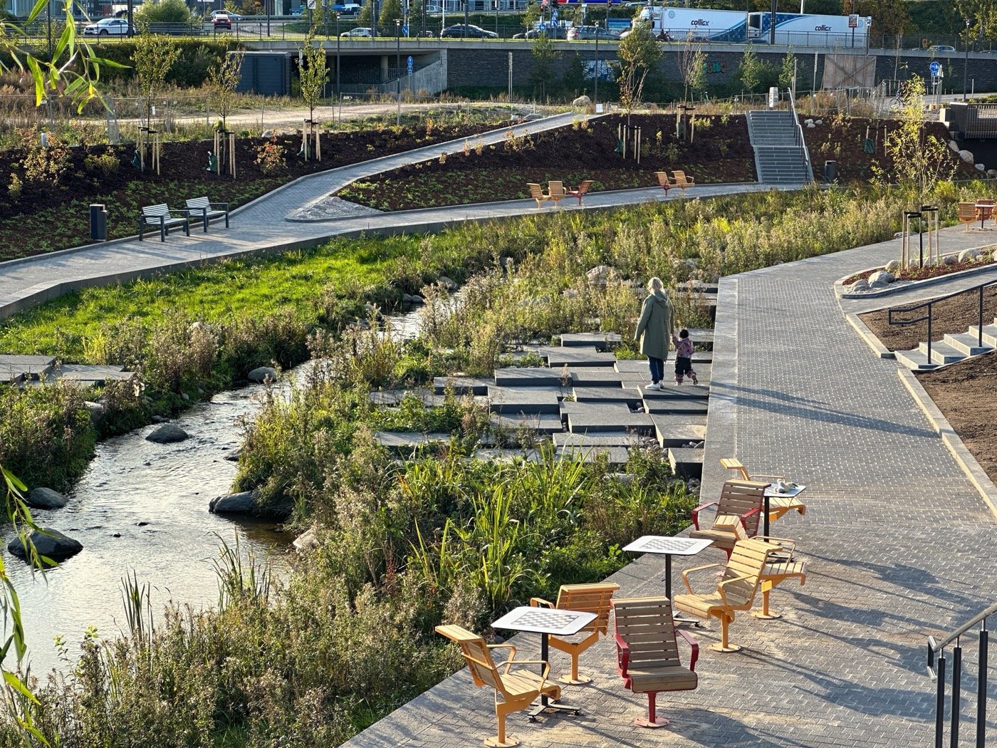 Điểm nối bật của dự án là dòng suối Monikonpuro – vốn nhỏ bé và dễ bị tổn thương – đã trở thành linh hồn của thiết kế: vừa được cải tạo để cung cấp điều kiện môi trường sống tốt hơn cho cá hồi, vừa đóng vai trò là trục sinh thái kết nối toàn bộ công viên.
