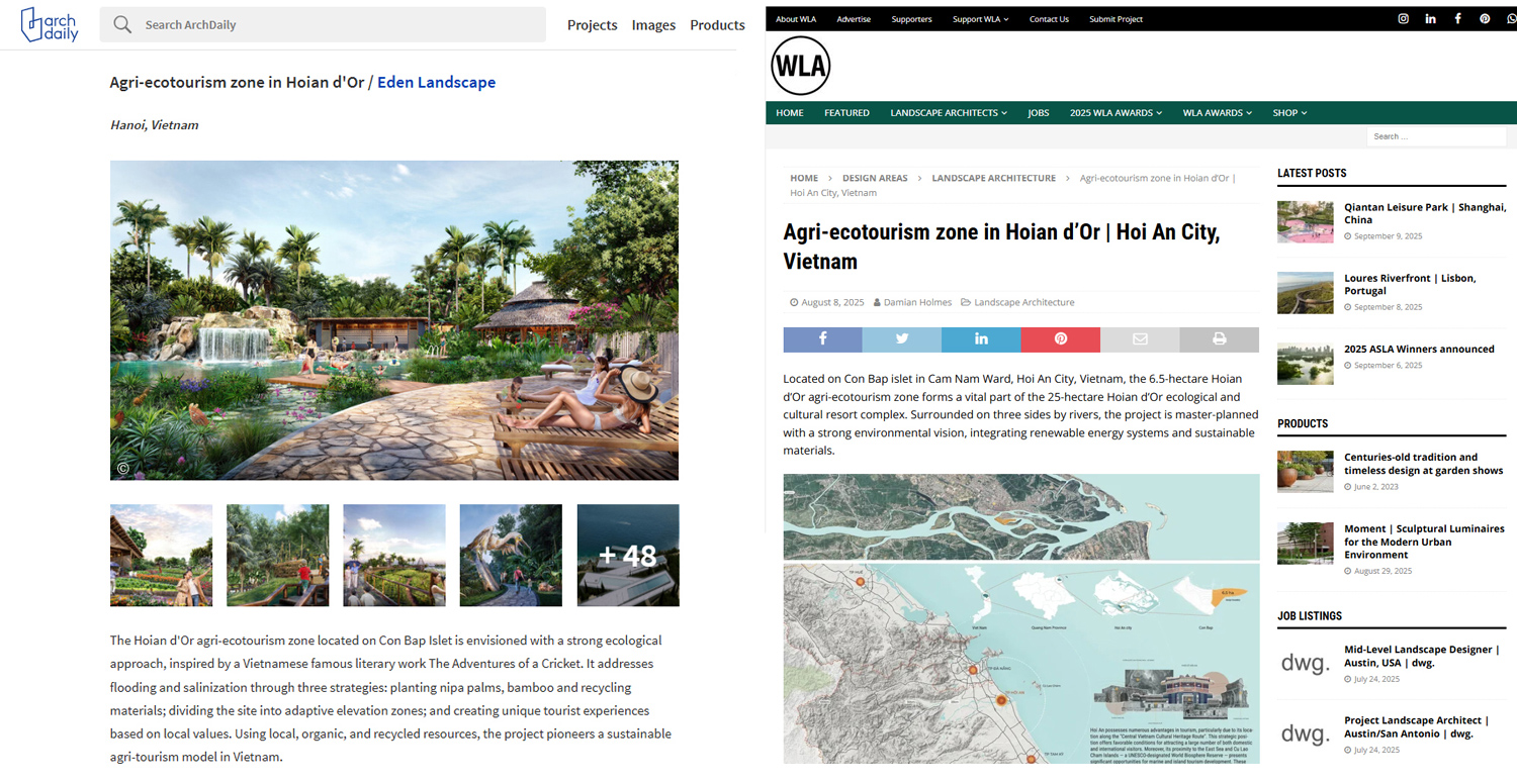 Chúng tôi tự hào khi dự án Khu nông nghiệp sinh thái – Hoian d’Or do Eden Landscape thiết kế đã liên tiếp được giới thiệu trên hai tạp chí kiến trúc và cảnh quan uy tín hàng đầu thế giới: