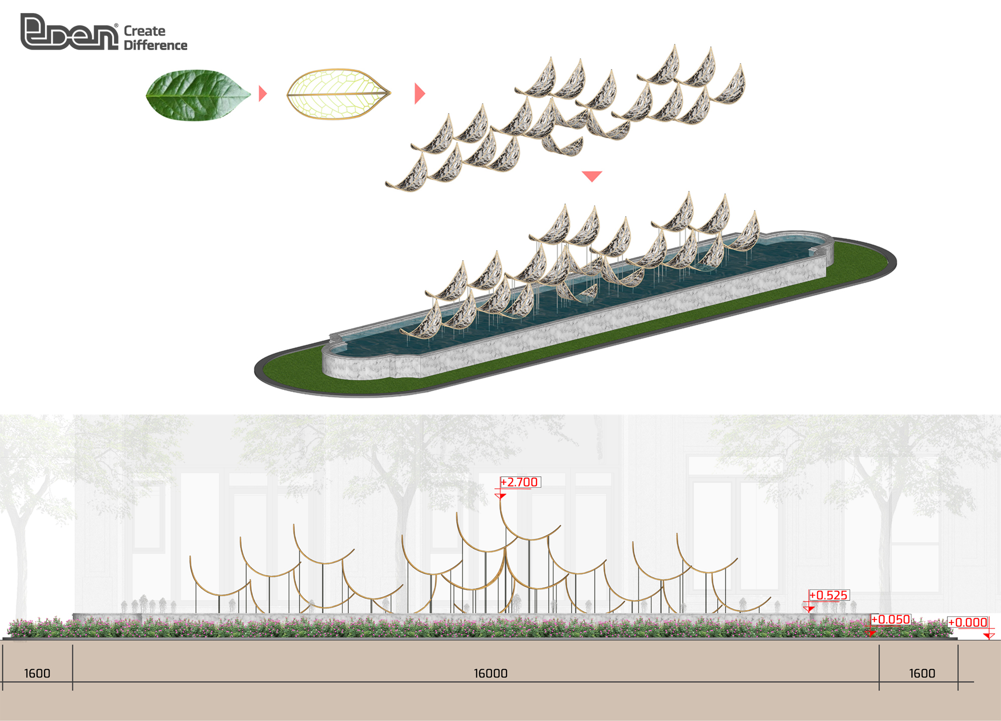 Với Eden Landscape, đây là một cách tiếp cận tiêu biểu cho giá trị thiết kế Native – một trong bốn giá trị nền tảng định hình ngôn ngữ thiết kế của chúng tôi. Việc khai thác hình ảnh lá chè không chỉ thể hiện sự tôn vinh giá trị bản địa, mà còn là chiến lược thiết kế có chủ đích nhằm tăng khả năng nhận diện và tạo cảm xúc nơi chốn (sense of place) – một điều rất quan trọng trong thiết kế cảnh quan đô thị hiện đại.