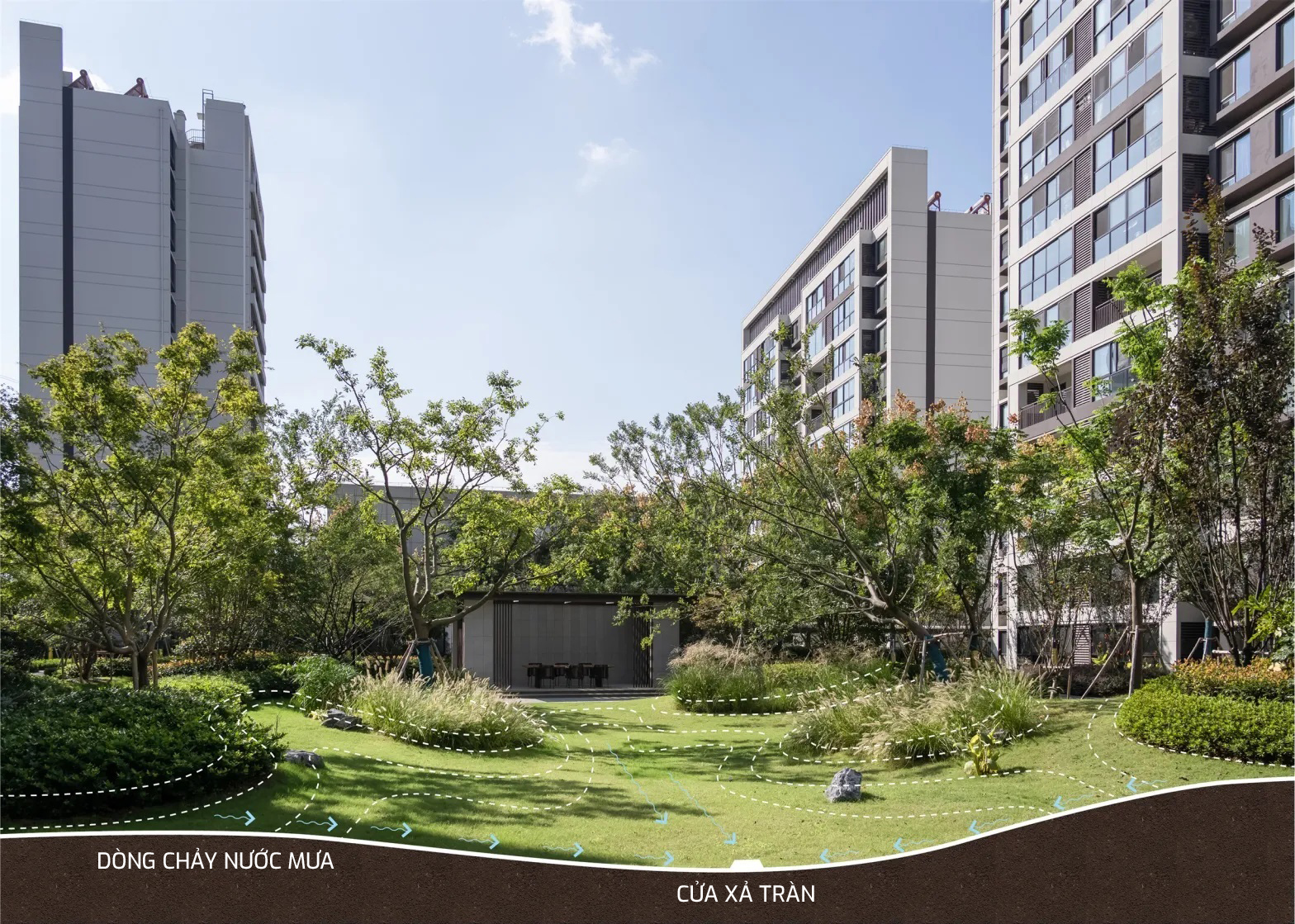 • Ba cấp độ vườn mưa: bố trí hài hòa giữa tầm nhìn tự nhiên và nhân văn, tận dụng khoảng xanh xen giữa các tòa nhà để hình thành hệ sinh thái cộng đồng.