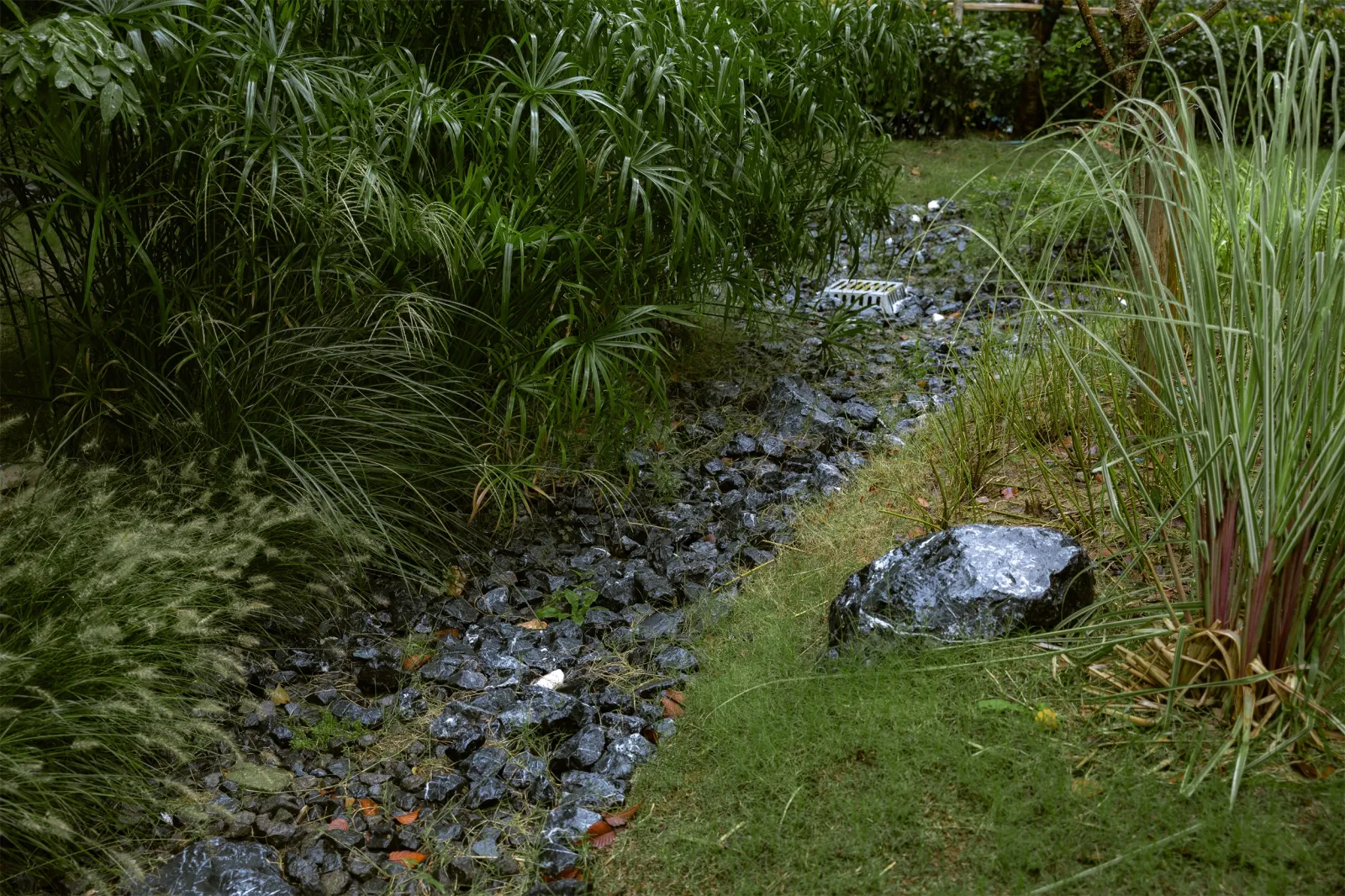 • Vườn trũng kết hợp cây thân thảo, thủy sinh, cây hoa lâu năm cùng vành đai sỏi: vừa tạo hiệu ứng cảnh quan, vừa hỗ trợ thoát nước cho tòa nhà, đồng thời xử lý – tái sử dụng nước mưa.